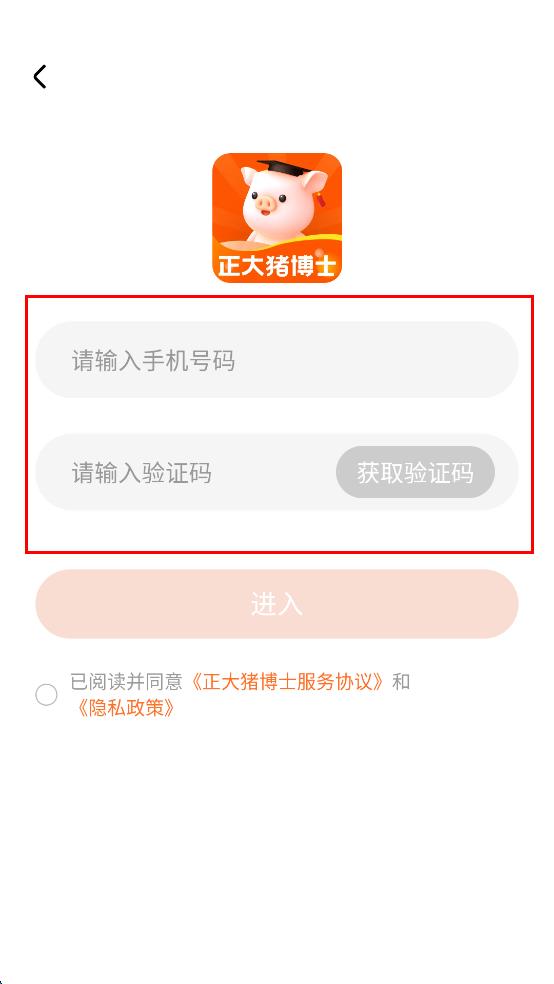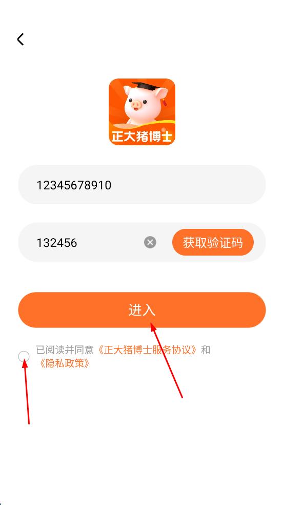 4、勾選“已閱讀并同意正大豬博士服務(wù)協(xié)議和隱私政策,然后點(diǎn)擊“進(jìn)入”按鈕,完成正大豬博士APP的登錄操作。
