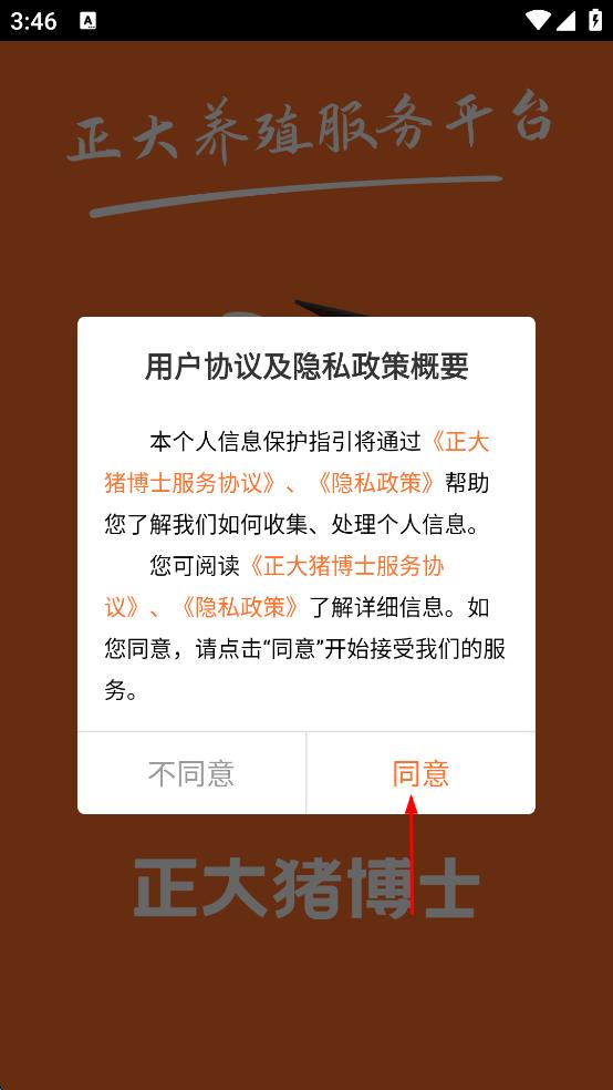 1、打開正大豬博士APP,進(jìn)入用戶協(xié)議及隱私政策概要頁面,仔細(xì)閱讀相關(guān)內(nèi)容后,點(diǎn)擊“同意”按鈕,進(jìn)入APP首頁。