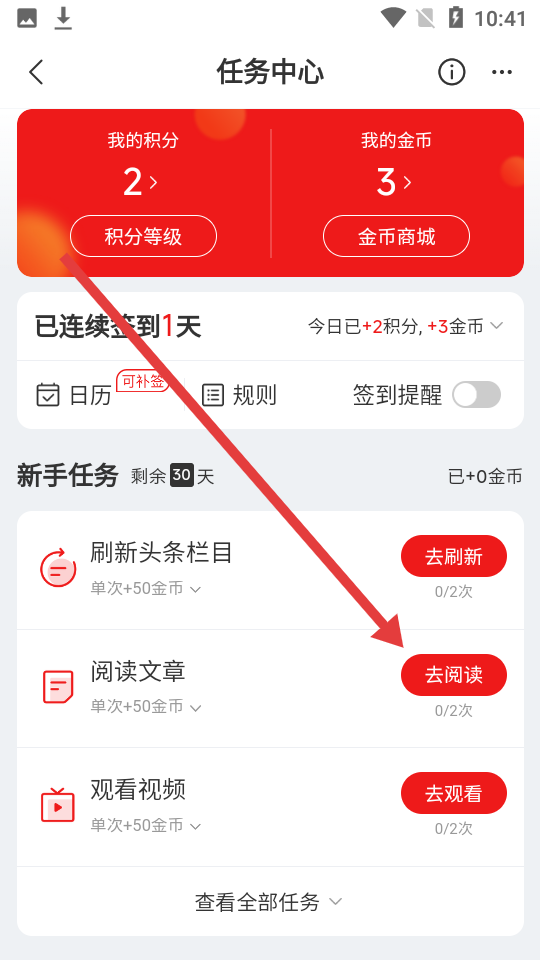 2、在任務(wù)中心里找到閱讀文章,點擊去閱讀完成任務(wù)賺金幣。