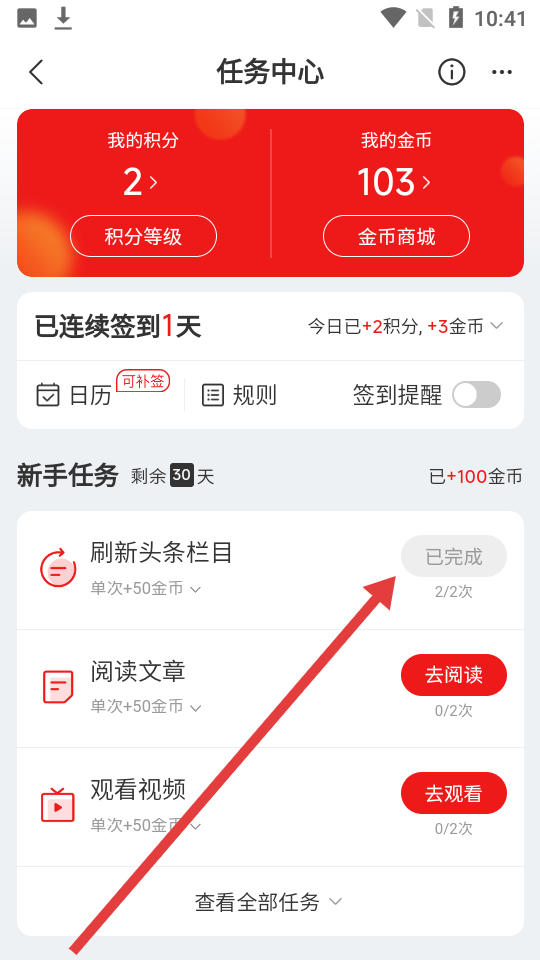 3、完成如刷新頭條欄目等新手任務(wù)后,其按鈕會顯示已完成,則可賺取金幣。