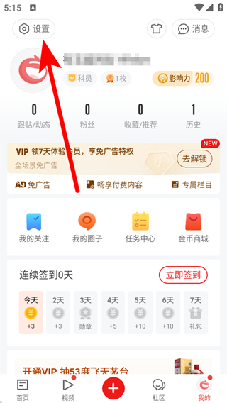2、在個人功能板塊頁面,點擊左上角的設(shè)置按鈕,進入設(shè)置操作界面。