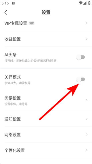 3、在設(shè)置操作界面中,找到關(guān)懷模式的開關(guān)并點擊開啟,彈出確認提示框。