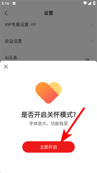 4、在確認提示框中,需要點擊立即開啟,完成關(guān)懷模式的設(shè)置操作。