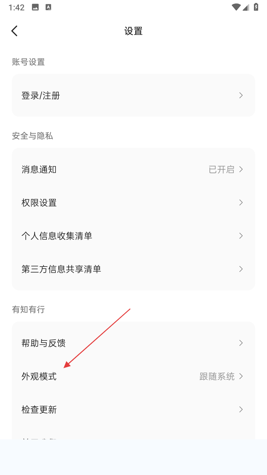3、在設(shè)置界面里,找到外觀模式選項(xiàng)并點(diǎn)擊。