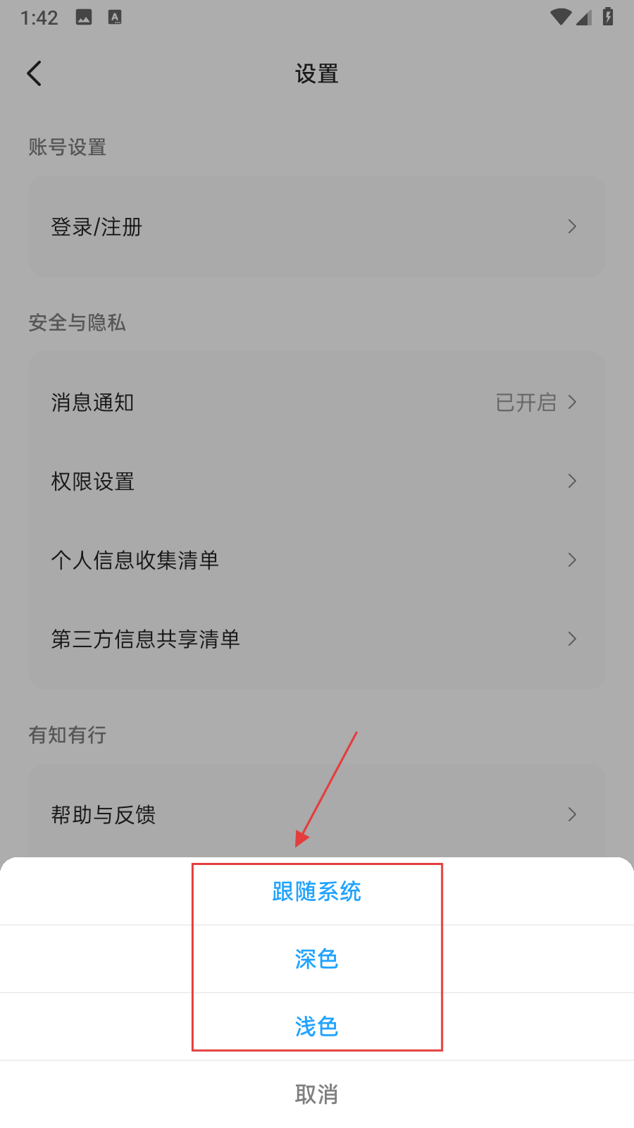 4、隨后可選擇跟隨系統(tǒng),深色或淺色模式,完成外觀設(shè)置。