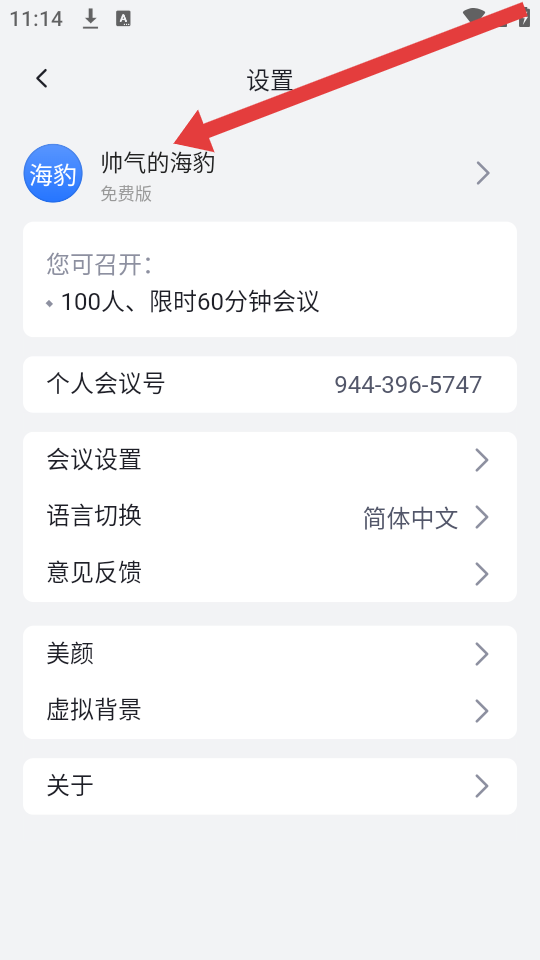 1、打開網(wǎng)易會議APP,點擊頁面右下角設(shè)置圖標,進入設(shè)置界面后,點擊頂部頭像及昵稱區(qū)域,進入個人中心。