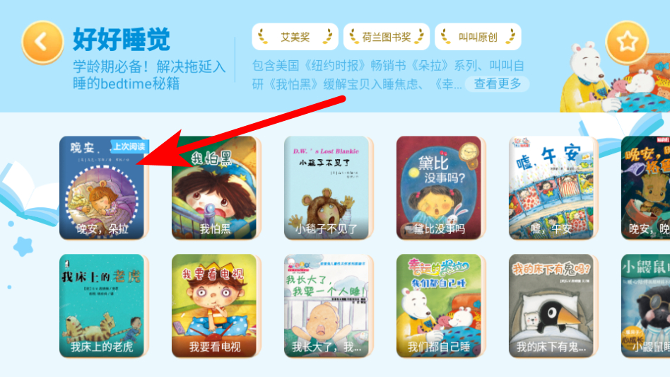 1、打開叫叫繪本APP,在行為習(xí)慣專區(qū)中選擇要閱讀的繪本如晚安,朵拉,進入繪本詳情頁。