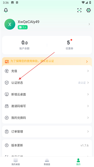 1、打開青椒云應(yīng)用,在我的頁(yè)面點(diǎn)擊認(rèn)證狀態(tài)選項(xiàng)。