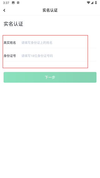 3、填寫真實(shí)姓名和身份證號(hào),點(diǎn)擊下一步,進(jìn)入刷臉認(rèn)證。