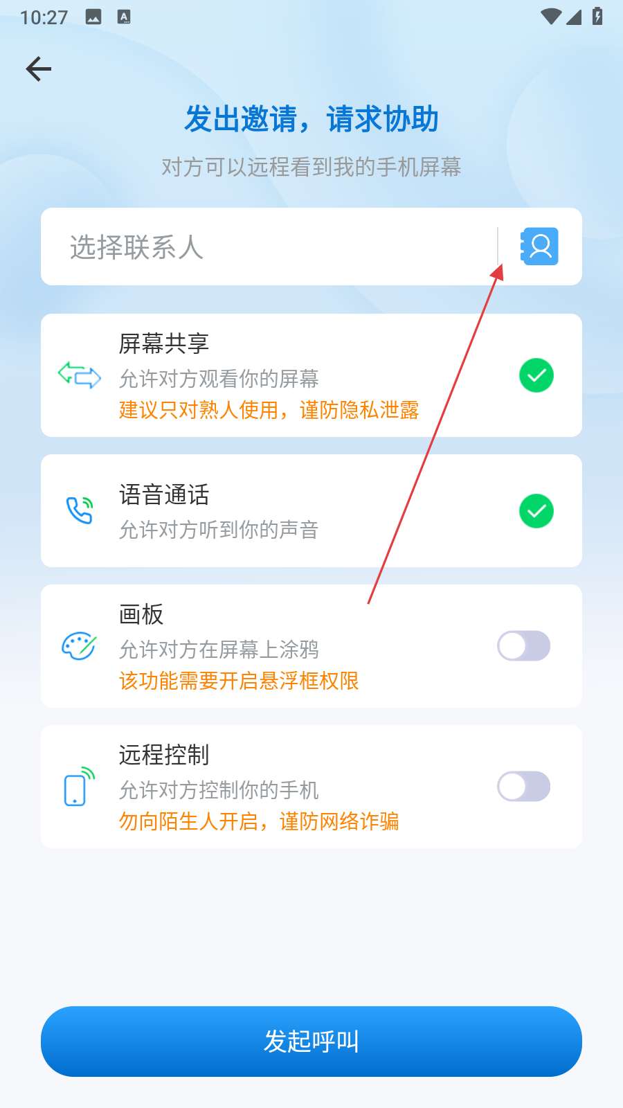 2、在發(fā)出邀請(qǐng)請(qǐng)求協(xié)助的頁面中,找到選擇聯(lián)系人區(qū)域旁邊的聯(lián)系人圖標(biāo)并點(diǎn)擊,進(jìn)入聯(lián)系人列表頁面。