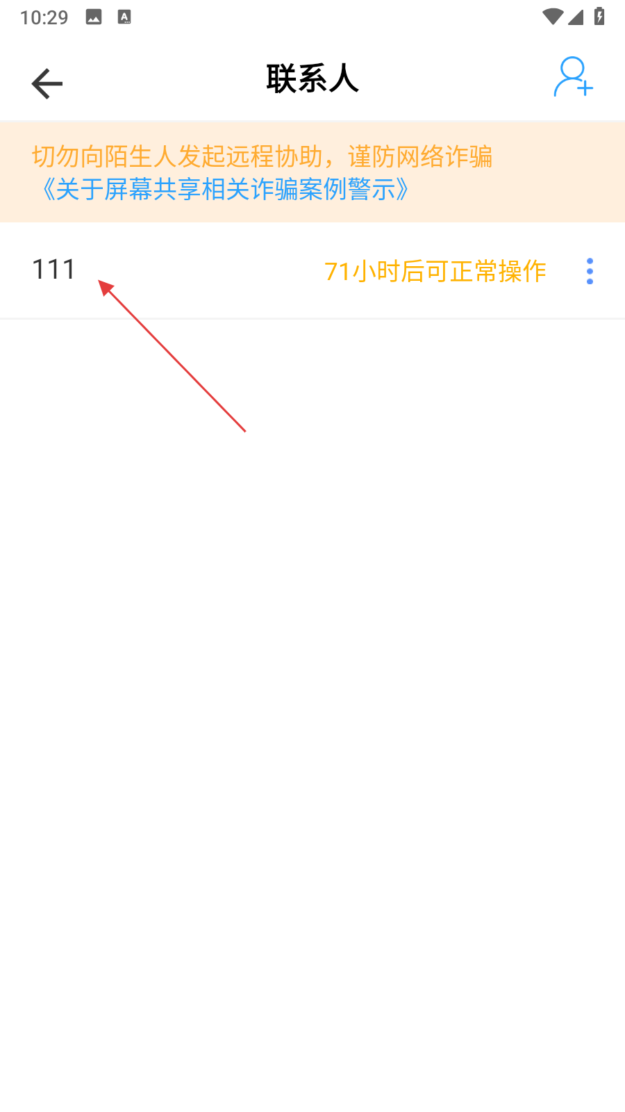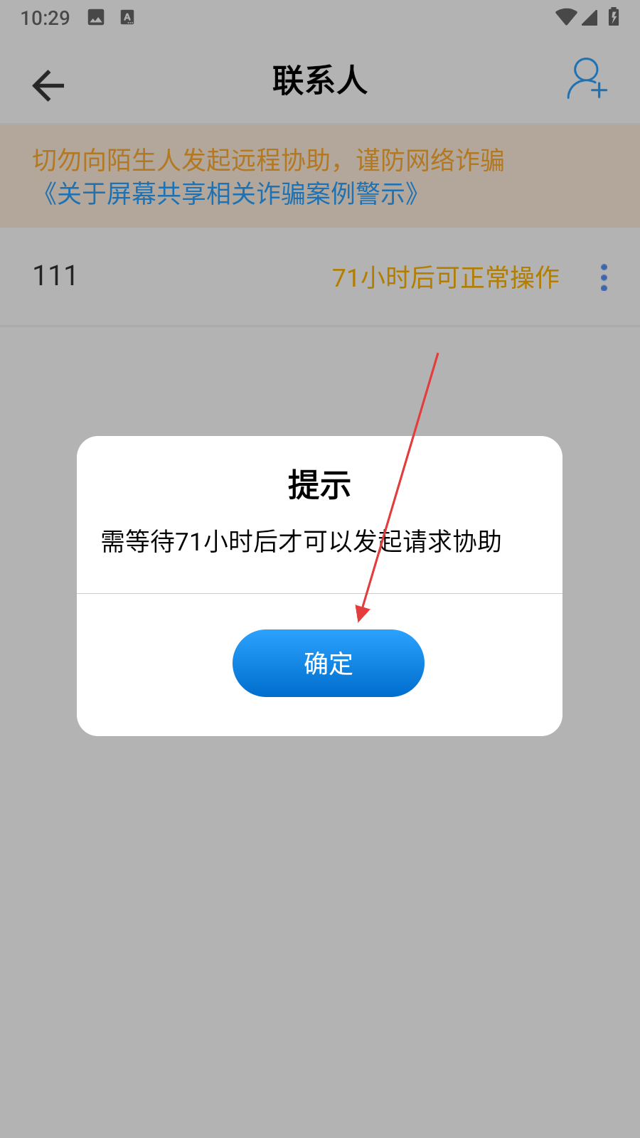3、在聯(lián)系人列表頁面,點(diǎn)擊需要發(fā)起屏幕共享的聯(lián)系人,此時(shí)會(huì)有操作限制會(huì)彈出提示框,提示需等待特定時(shí)長才能發(fā)起請(qǐng)求協(xié)助。
