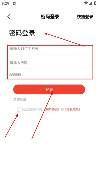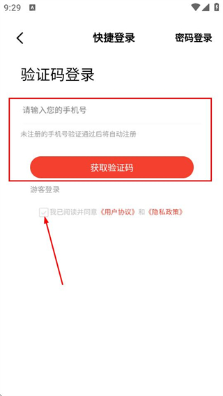 4、或切換到密碼登錄頁面,輸入手機號和密碼,勾選用戶協(xié)議和隱私政策,點擊登錄。