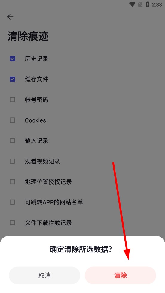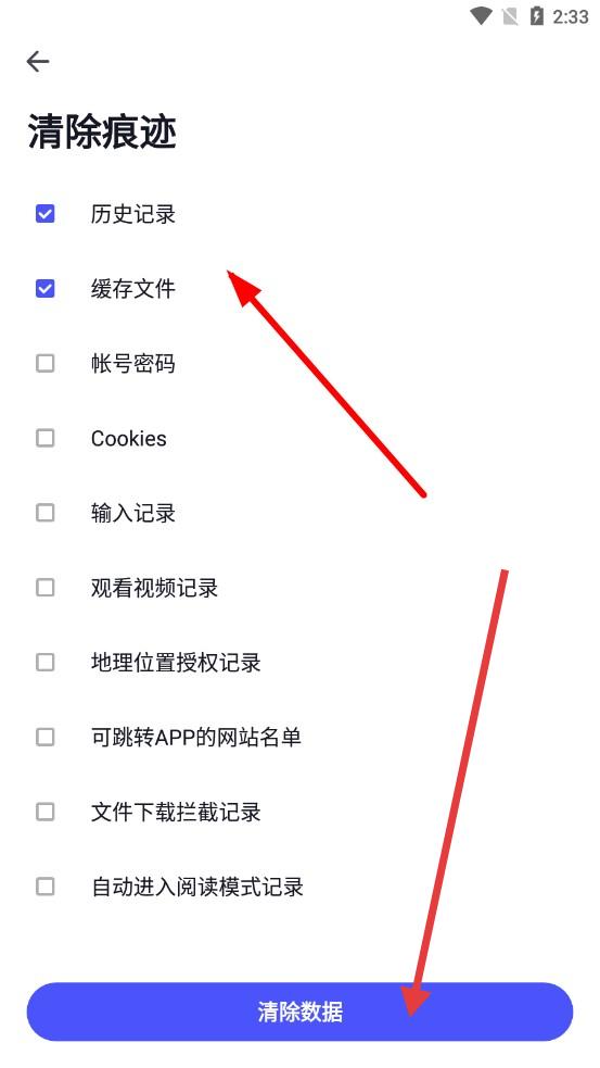 2、在清除痕跡界面,勾選想要清除的記錄類型,點擊清除數據。