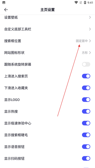 4、找到搜索框位置選項,點擊進入搜索框設置頁面。
