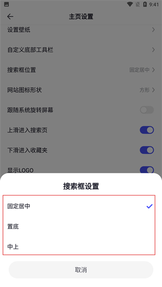 5、在搜索框設置頁面可選擇固定居中、置底、中上。