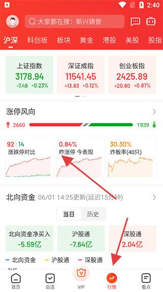 4、行情板塊可查看上證指數(shù)、深證成指等指數(shù),還有漲停風(fēng)向、北向資金等市場數(shù)據(jù)。