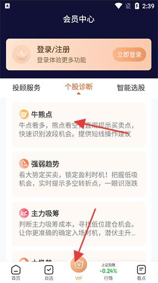 3、VIP會員中心有投顧服務(wù)、個股診斷、智能選股等功能,如牛熊點、強弱趨勢、主力吸籌等特色分析工具。