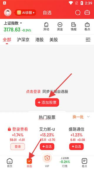 2、自選板塊可添加股票,同步云端自選股,查看熱門股票行情。