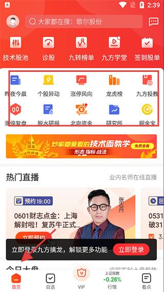 1、提供技術(shù)股池、診股、九轉(zhuǎn)榜單、九方學(xué)堂、簽到跟單等功能板塊,還有昨夜今晨、個股異動、漲停風(fēng)向等入口。