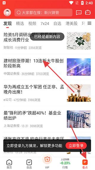 5、看點板塊提供精選資訊、視頻、7×24小時財經(jīng)新聞等內(nèi)容,涵蓋成長消費行業(yè)、建材股等熱點題材。