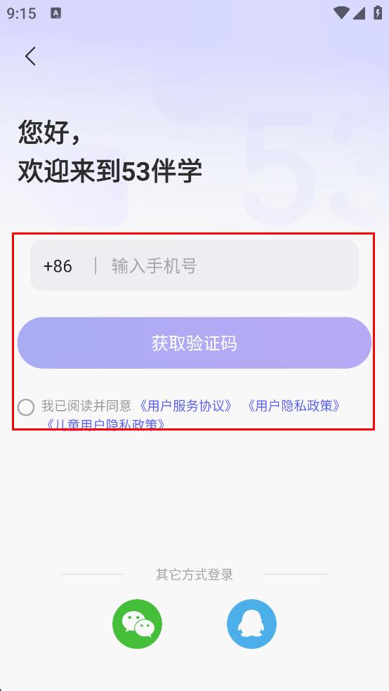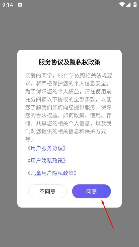 1、打開53伴學APP,在彈出的服務協(xié)議及隱私權政策頁面,點擊“同意”按鈕,進入APP主界面。