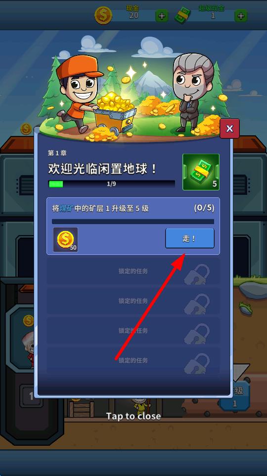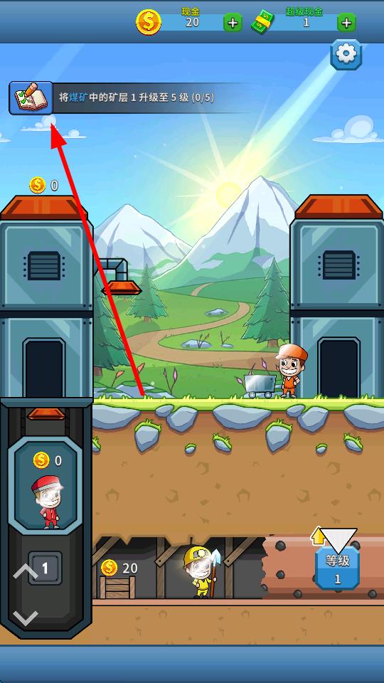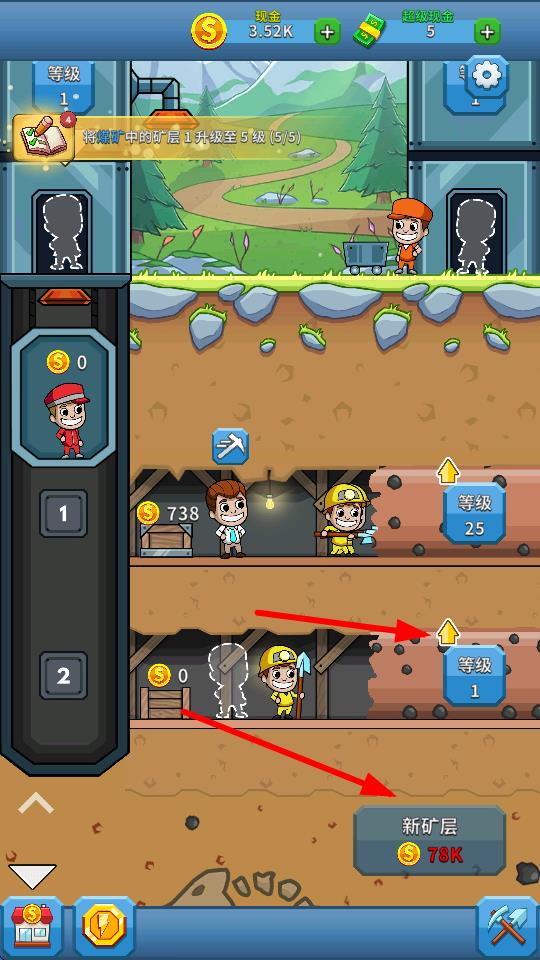 3、隨著游戲推進(jìn)獲得金幣,可升級礦層,點(diǎn)擊礦層旁的等級按鈕進(jìn)行升級操作。當(dāng)滿足條件后-還能點(diǎn)擊新礦層按鈕解鎖新礦層擴(kuò)大采礦規(guī)模。