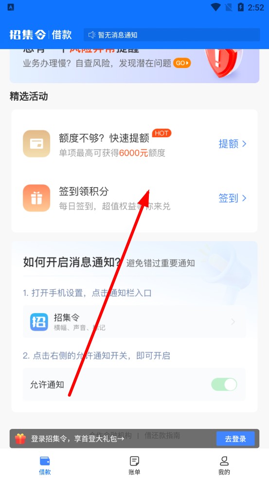 1、打開招集令APP,進入主界面后,點擊額度數(shù)字右側的「領取額度」按鈕,按照提示完成身份認證、信息填寫等流程,來獲取借款額度。