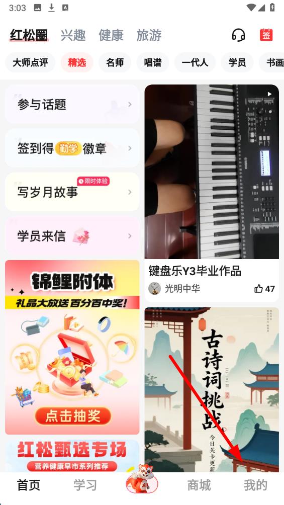 1、打開紅松課堂app進(jìn)入首頁,點(diǎn)擊底部導(dǎo)航欄中我的選項(xiàng)進(jìn)入個(gè)人相關(guān)界面。