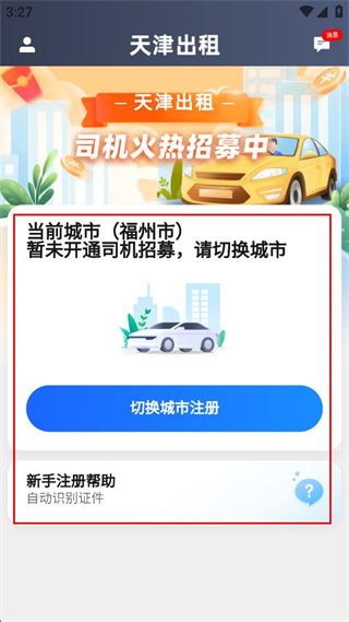 3、進入注冊提示頁面,查看當(dāng)前城市是否開通司機招募。