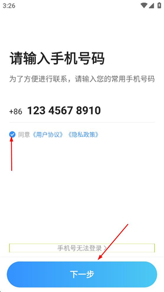 1、打開天津出租APP,輸入手機號碼,勾選同意用戶協(xié)議和隱私政策,點擊下一步。