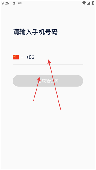 2、進(jìn)入手機(jī)號(hào)碼輸入頁面,確認(rèn)國家區(qū)號(hào)無誤后,填寫手機(jī)號(hào)碼,點(diǎn)擊獲取驗(yàn)證碼。