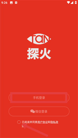 1、打開探火APP,在勾選已閱讀并同意用戶協(xié)議和隱私政策,點(diǎn)擊手機(jī)登錄選項(xiàng)。