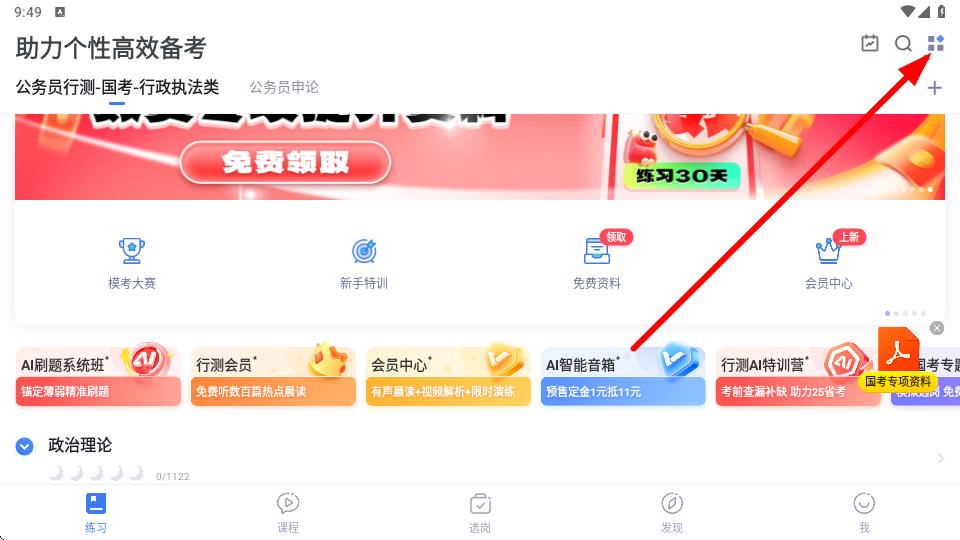 1、打開粉筆APP進(jìn)入主界面,點(diǎn)擊右上角九宮格圖標(biāo),進(jìn)入更多功能頁面。