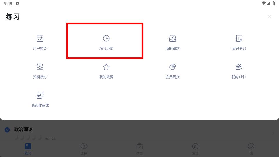 2、在更多功能頁面中找到并點(diǎn)擊練習(xí)歷史選項(xiàng),進(jìn)入練習(xí)歷史記錄界面。
