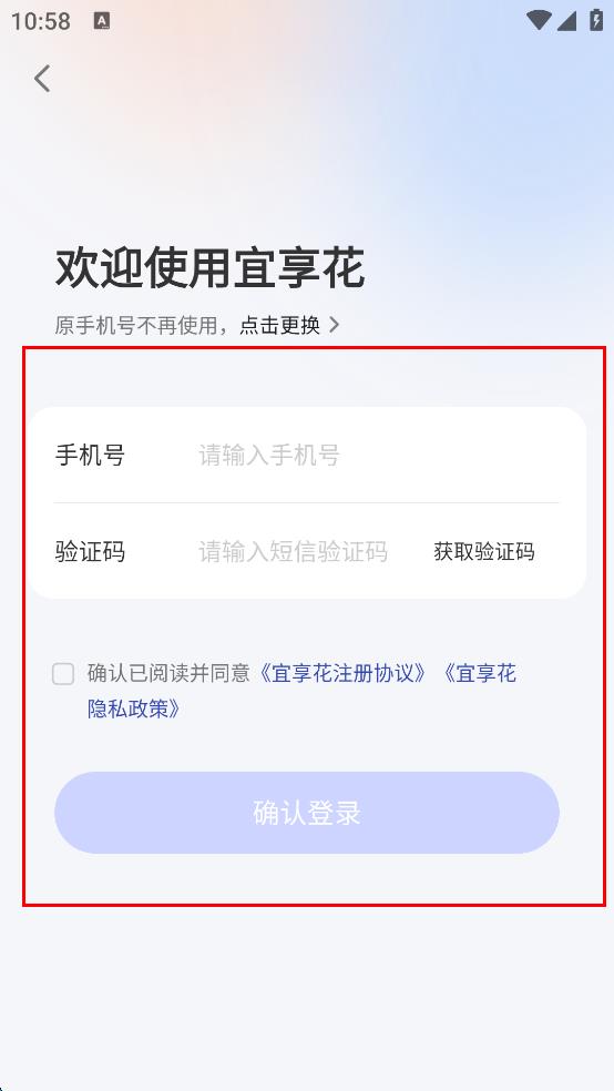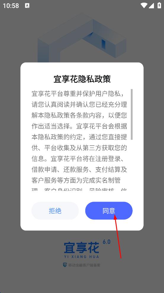 1、打開宜享花APP,在彈出的隱私政策提示框中,認(rèn)真閱讀相關(guān)內(nèi)容后,點(diǎn)擊“同意”,進(jìn)入APP主界面。