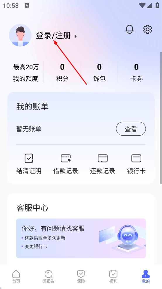 3、在個人頁面,點(diǎn)擊“登錄/注冊”選項(xiàng),進(jìn)入登錄信息填寫頁面。