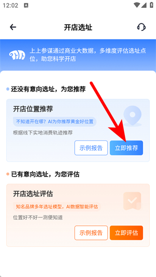 2、進(jìn)入開店選址頁(yè)面后,若還沒有意向選址,點(diǎn)擊立即推薦。