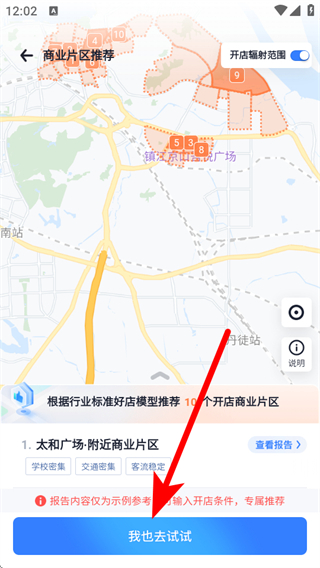 4、點(diǎn)擊底部我也去試試,輸入開店條件,獲取專屬商業(yè)片區(qū)推薦。