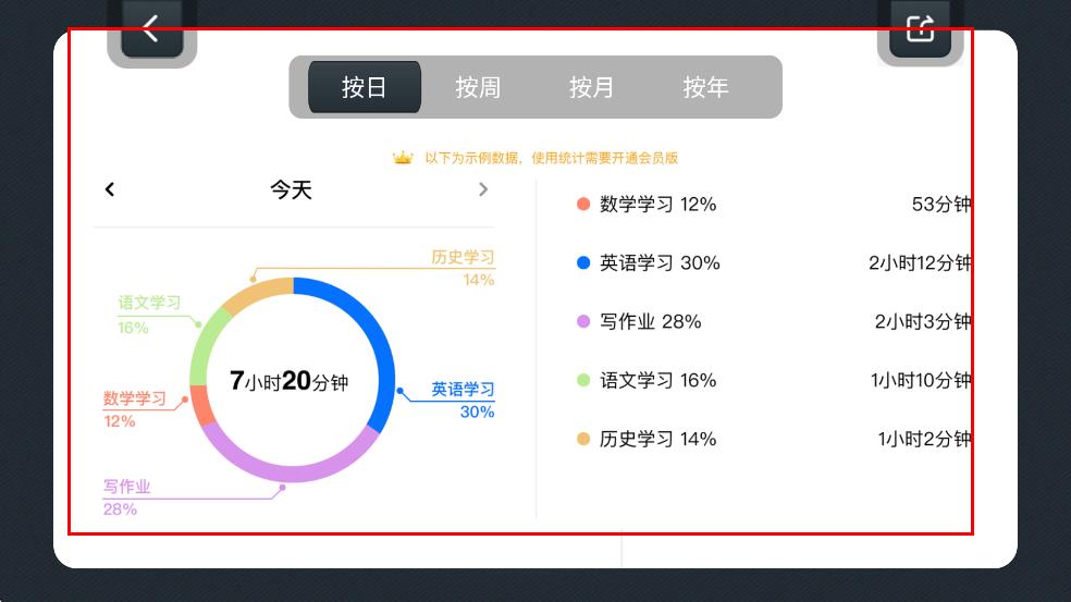 4、在統(tǒng)計(jì)界面中,能看到各學(xué)科學(xué)習(xí)時(shí)間占比及具體時(shí)長,完成學(xué)習(xí)統(tǒng)計(jì)查看。