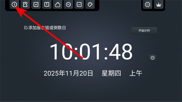 1、在計(jì)時(shí)軟件主界面,點(diǎn)擊左上角計(jì)時(shí)器圖標(biāo),進(jìn)入計(jì)時(shí)器頁面。