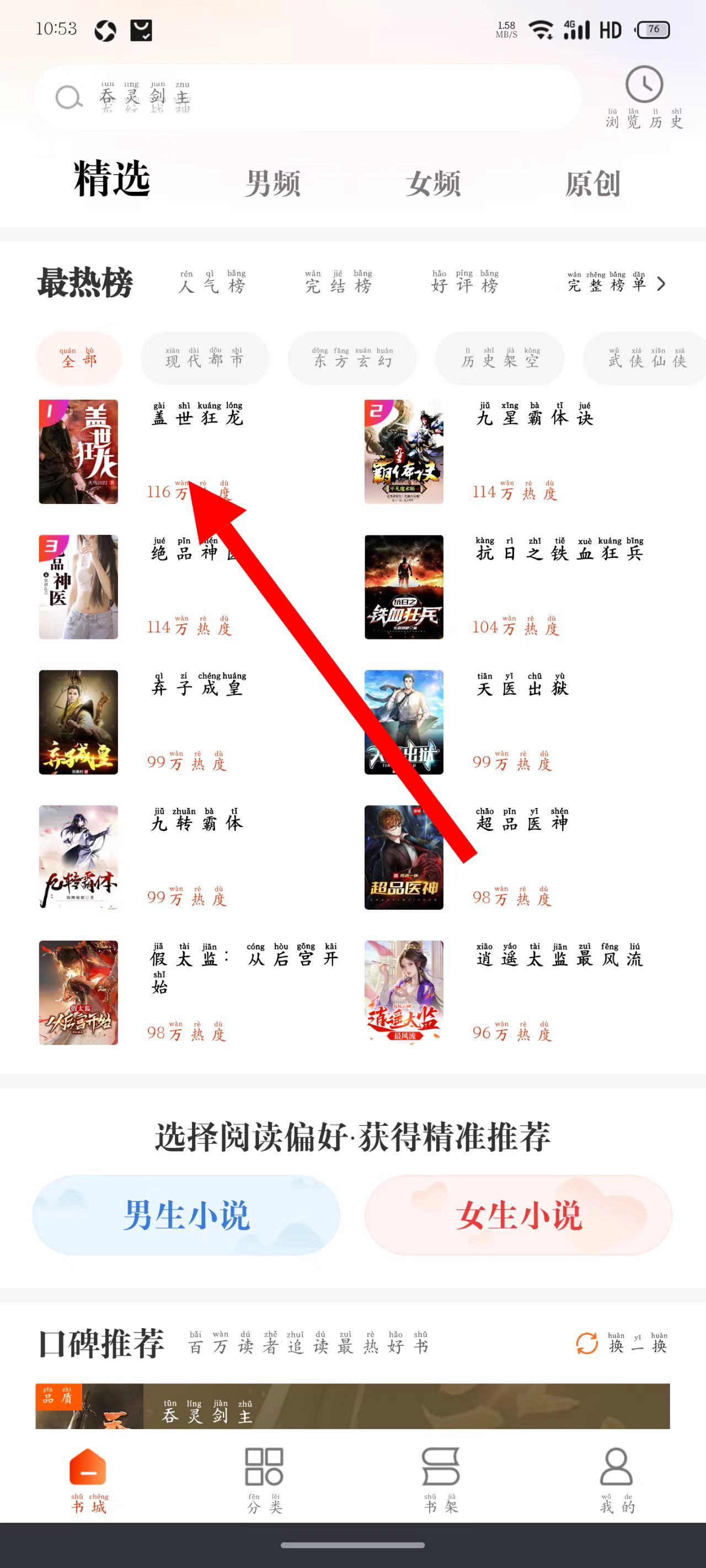 1、打開洋蔥小說APP,在首頁(yè)的最熱榜等榜單中,選擇想要聽的小說,比如蓋世狂龍。