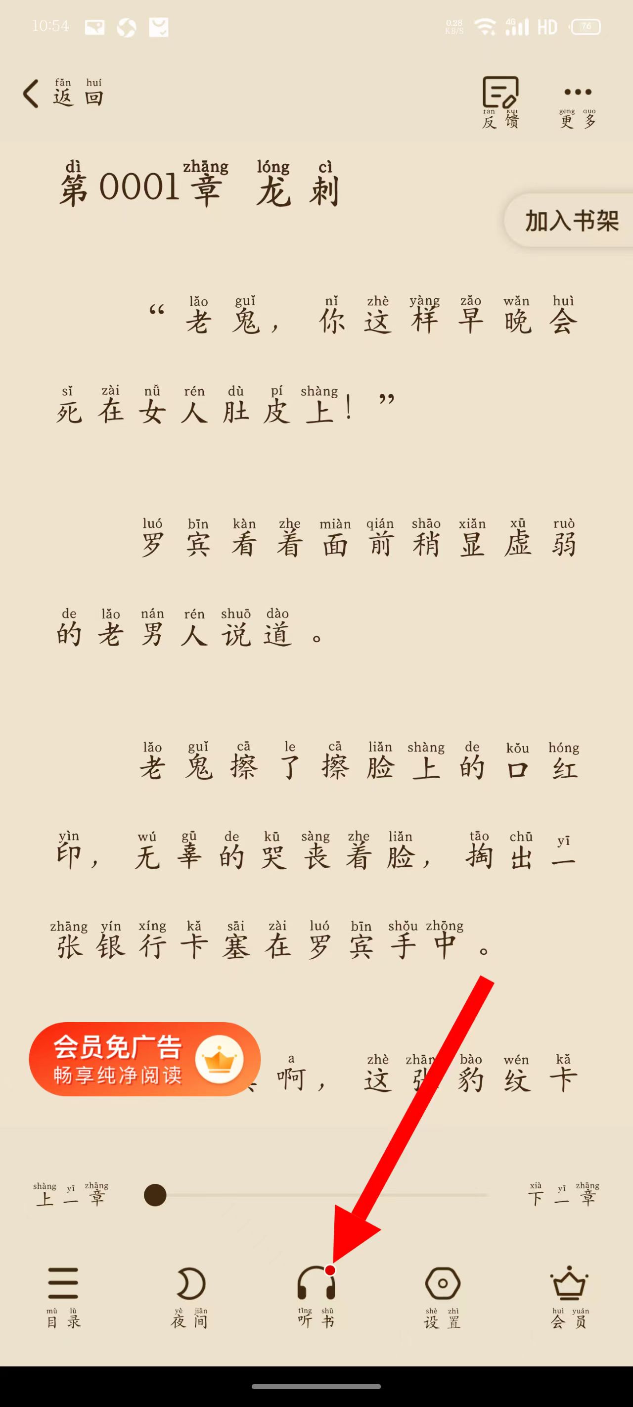 3、在小說閱讀界面,點(diǎn)擊底部導(dǎo)航欄中的聽書圖標(biāo)。