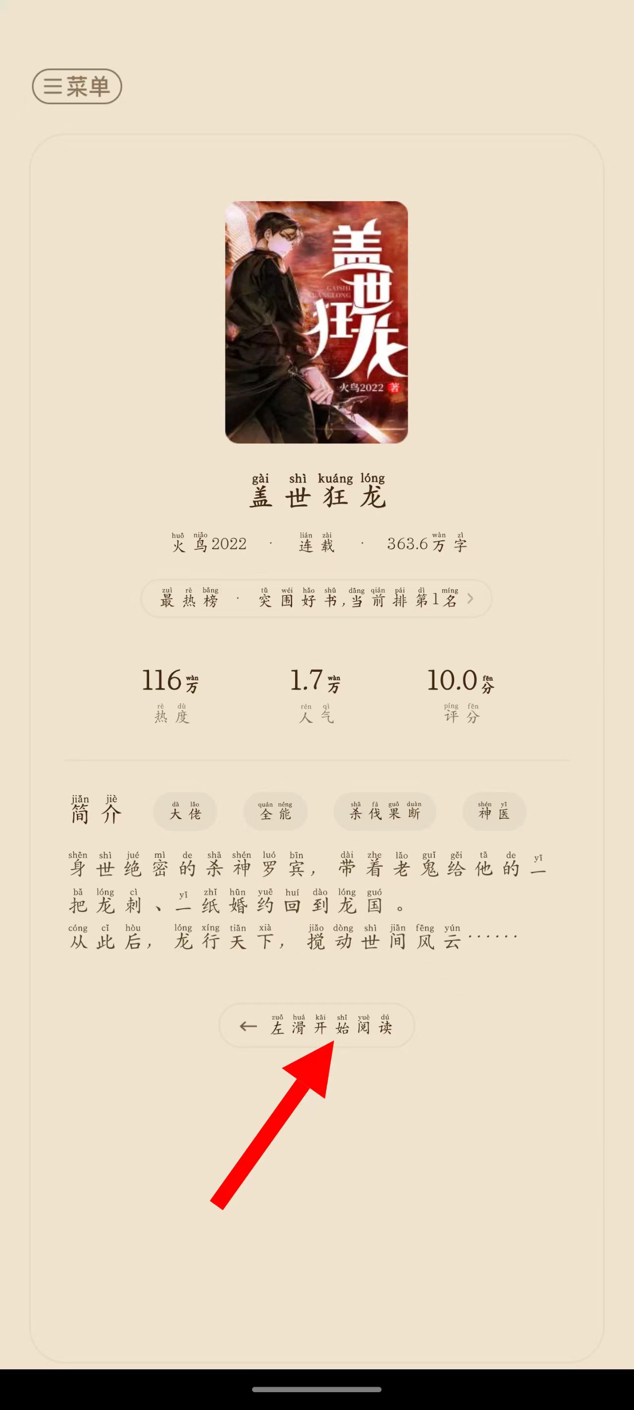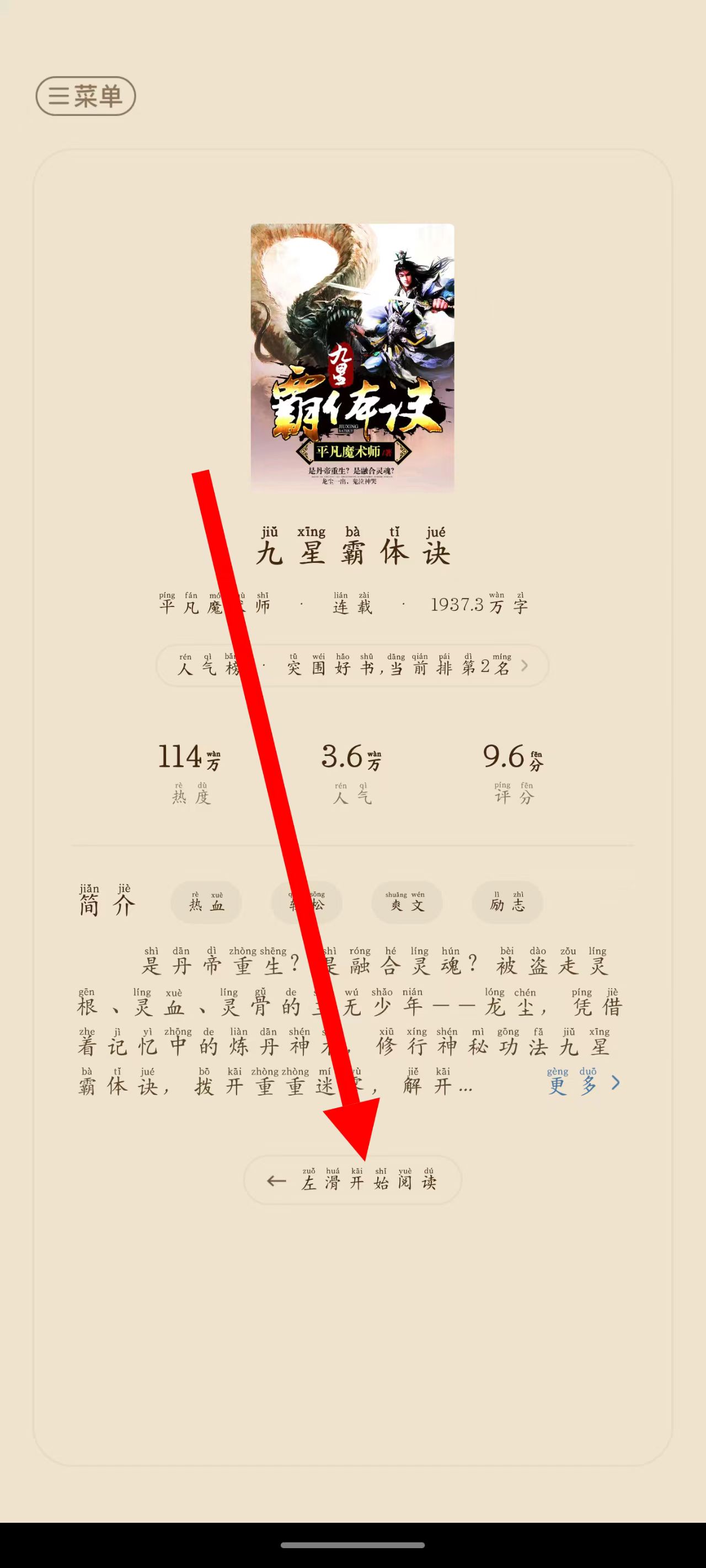 2、進(jìn)入小說詳情頁(yè),按照提示左滑屏幕開始閱讀小說。