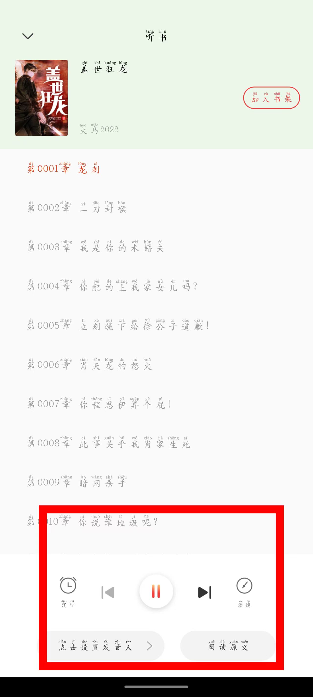 4、進(jìn)入聽書界面后,即可使用播放、暫停、切換章節(jié)、設(shè)置定時(shí)、調(diào)整語(yǔ)速等功能聽書。