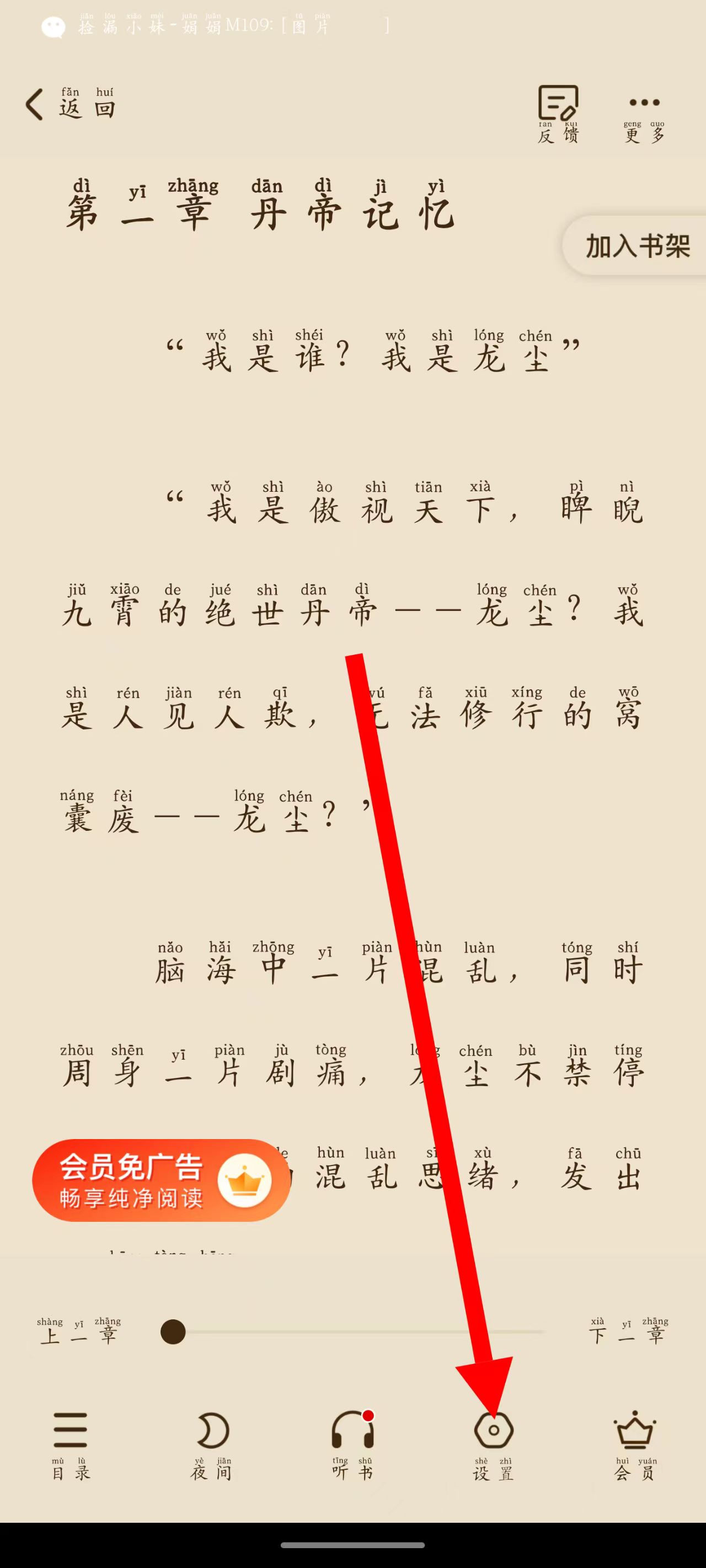 3、在小說閱讀界面,點(diǎn)擊設(shè)置選項(xiàng),展開閱讀設(shè)置菜單。