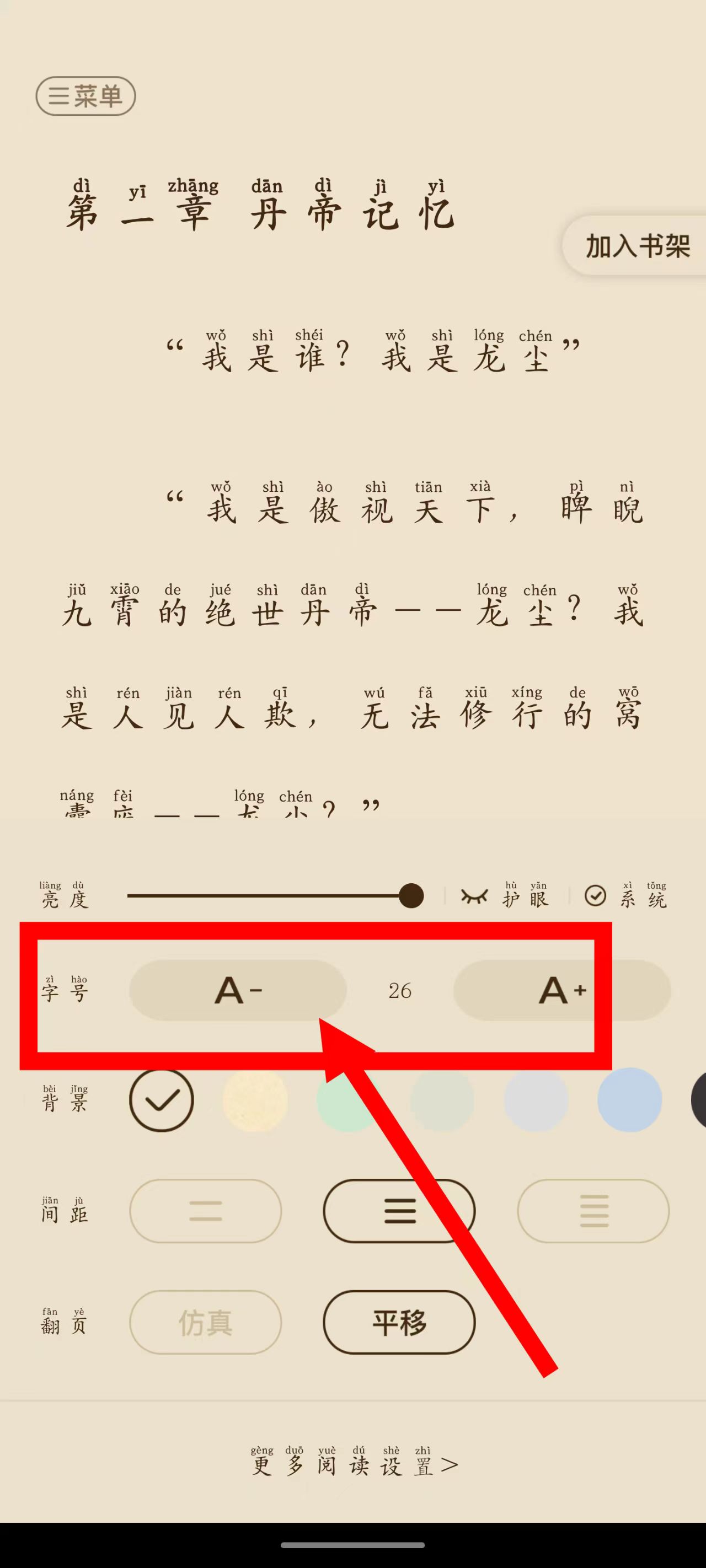 4、在閱讀設(shè)置菜單中,點(diǎn)擊字號(hào)區(qū)域的A-或A+按鈕,即可調(diào)整字體大小。