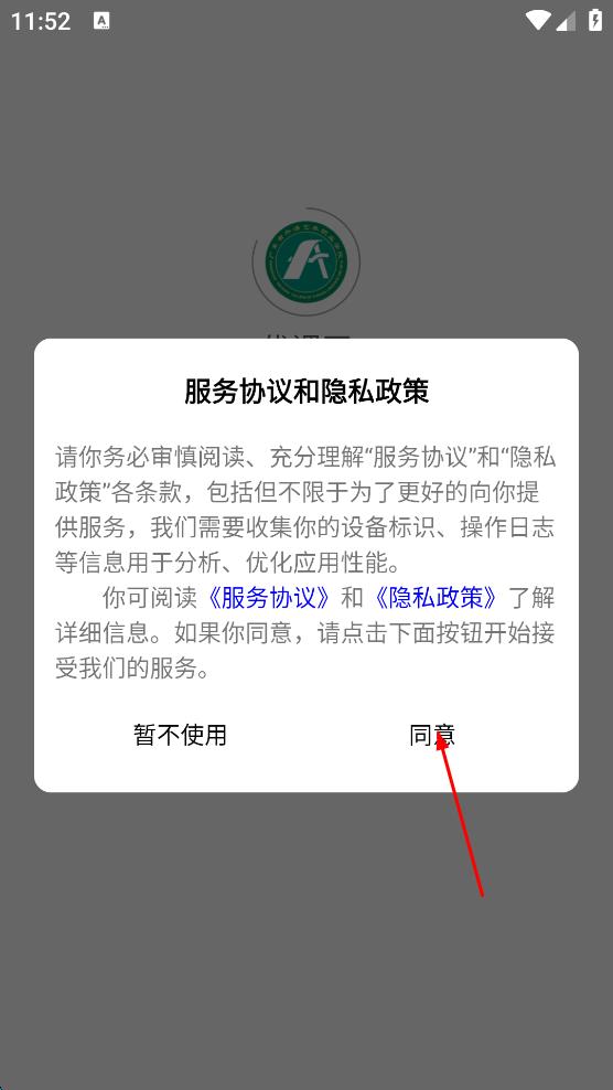 1、打開優(yōu)課網(wǎng)App,在服務協(xié)議和隱私政策頁面,點擊“同意”按鈕。