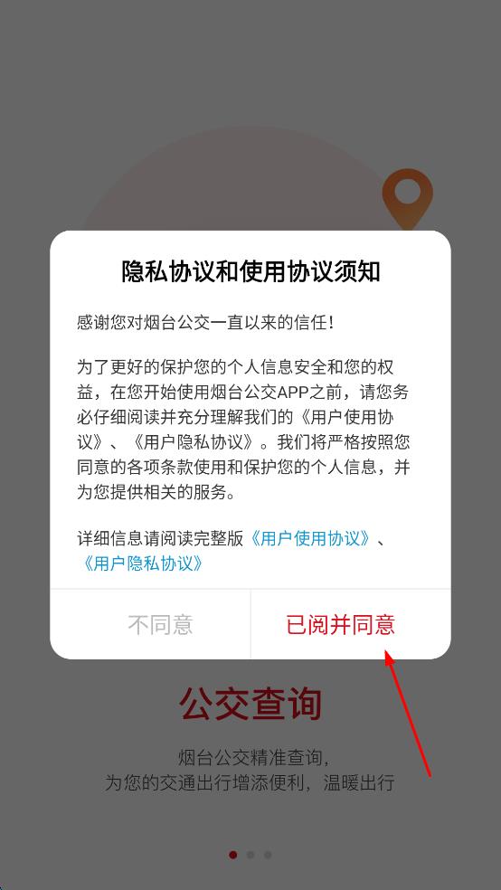 1、打開(kāi)煙臺(tái)公交APP,在彈出的隱私協(xié)議和使用協(xié)議須知提示框中,仔細(xì)閱讀相關(guān)內(nèi)容后,點(diǎn)擊“已閱并同意”,進(jìn)入APP主界面。