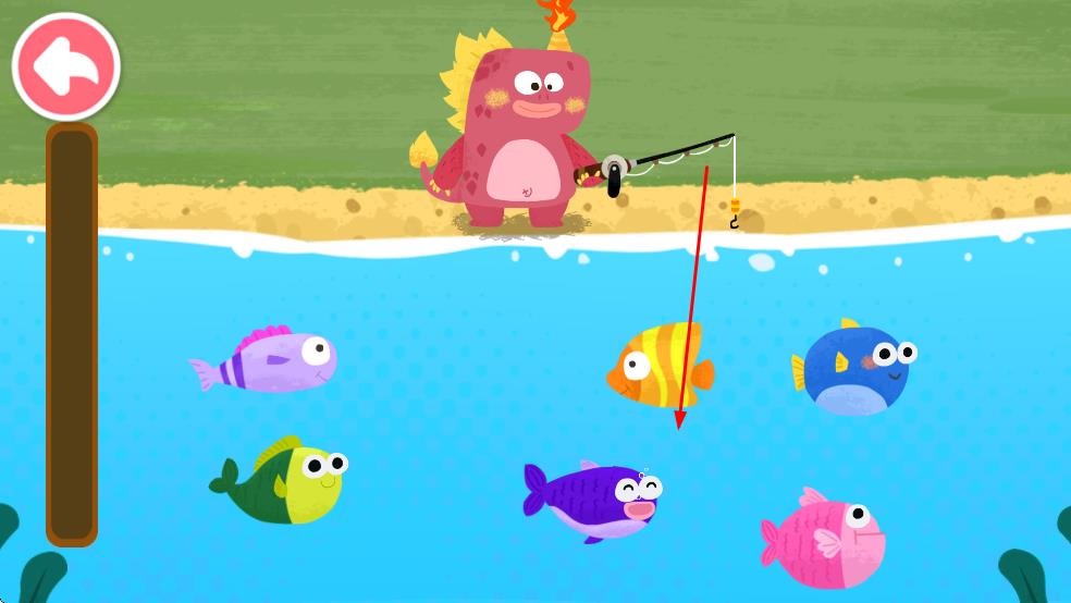 3、在釣魚場景中,操作釣魚竿釣到紫色小魚,滿足恐龍需求。