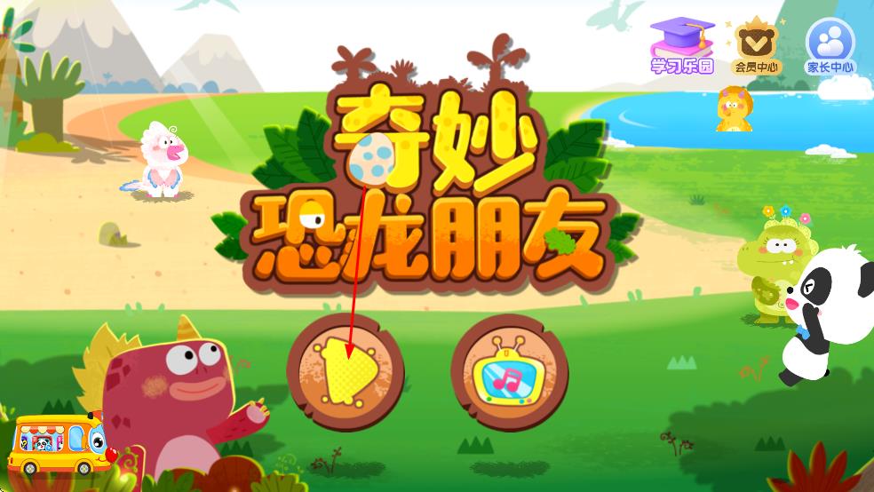1、點擊黃色三角形開始按鈕,進(jìn)入恐龍朋友互動場景。